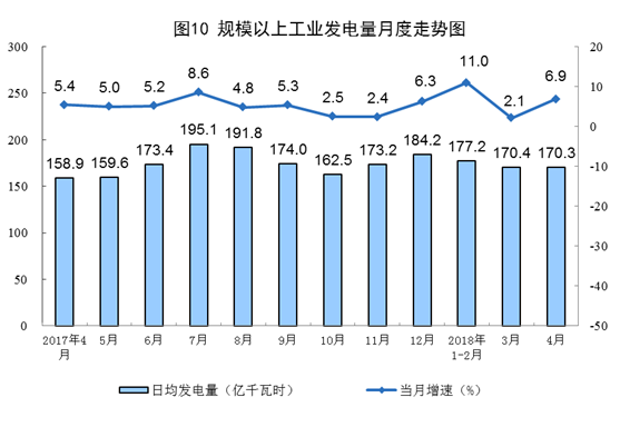 4月份,受用電需求增加影響,電力生產(chǎn)明顯加快,發(fā)電量5107.8億千瓦時(shí),同比增長6.9%,增速比上月加快4.8個(gè)百分點(diǎn)。1-4月份,發(fā)電量同比增長7.7%,增速較1-3月份回落0.3個(gè)百分點(diǎn)。