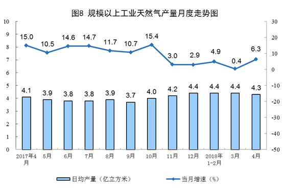 4月份,天然氣生產(chǎn)保持高位,產(chǎn)量128.9億立方米,同比增長6.3%,增速比上月加快5.9個(gè)百分點(diǎn);日均生產(chǎn)4.3億立方米,比上月減少0.1億立方米。