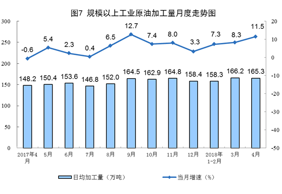 受去年同期大型石化企業(yè)停產(chǎn)檢修較多,以及今年原油進(jìn)口配額和成品油出口配額均大幅增加等多重因素影響,原油加工量增長較快。4月份,原油加工量4958萬噸,同比增長11.5%,比上月加快3.2個(gè)百分點(diǎn);日均加工165.3萬噸,比上月減少0.9萬噸。