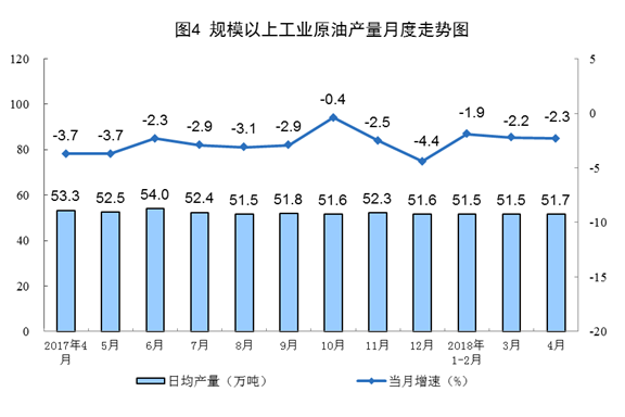 4月份,原油生產(chǎn)1551萬噸,同比下降2.3%,降幅比上月擴(kuò)大0.1個(gè)百分點(diǎn);日均產(chǎn)量51.7萬噸,比上月增加0.2萬噸。