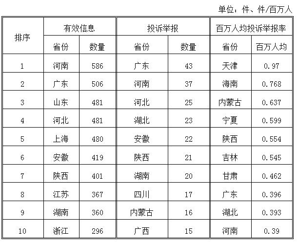 2018年5月,各?。ㄗ灾螀^(qū)、直轄市)按照有效信息數(shù)量排序,河南、廣東、山東、河北等省列全國前10位;按照投訴舉報數(shù)量排序,廣東、河南、河北等省排在全國前10位;按照百萬人均投訴舉報率排序,天津、海南、內(nèi)蒙古等?。ㄊ?、自治區(qū))位于全國前10位。(2018年5月有效信息及投訴舉報排名前10位情況見表三)