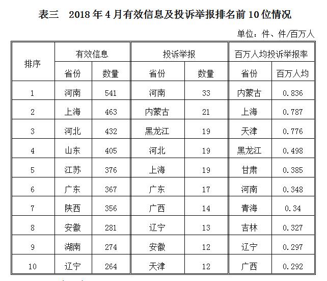 2018年4月,各?。ㄗ灾螀^(qū)、直轄市)按照有效信息數(shù)量排序,河南、上海、河北等省(市)列全國前10位;按照投訴舉報數(shù)量排序,河南、內(nèi)蒙古、黑龍江等?。ㄗ灾螀^(qū))排在全國前10位;按照百萬人均投訴舉報率排序,內(nèi)蒙古、上海、天津等?。ㄊ小⒆灾螀^(qū))位于全國前10位。(2018年4月有效信息及投訴舉報排名前10位情況見表三)