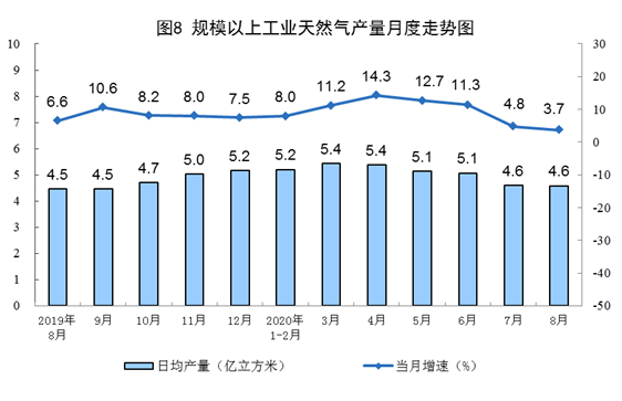 天然氣生產(chǎn)有所放緩。8月份,生產(chǎn)天然氣142億立方米,同比增長(zhǎng)3.7%,增速比上月放緩1.1個(gè)百分點(diǎn);日均產(chǎn)量4.6億立方米,與上月持平。1—8月份,生產(chǎn)天然氣1225億立方米,同比增長(zhǎng)8.8%。