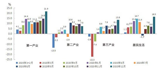 2020年,第一、二、三產(chǎn)業(yè)和居民生活用電量增速分別為10.7%、1.9%、1.4%、6.2%。其中,第一產(chǎn)業(yè)和居民生活用電量增速較上年分別上升5.0、1.5個百分點,第二、第三產(chǎn)業(yè)用電增速較上年分別下降0.5、7.5個百分點。第二產(chǎn)業(yè)用電量基本恢復(fù)常態(tài)化增長,第三產(chǎn)業(yè)用電量增長態(tài)勢較正常水平仍有較大差距。12月份,第一、二、三產(chǎn)業(yè)和居民生活用電量增速分別為21.9%、7.5%、13.6%、16.5%,第二產(chǎn)業(yè)用電量增速持續(xù)維持高位;第三產(chǎn)業(yè)用電量年內(nèi)首現(xiàn)兩位數(shù)增長,恢復(fù)態(tài)勢強勁;居民生活用電量受低溫寒潮天氣影響,增速創(chuàng)年內(nèi)新高。