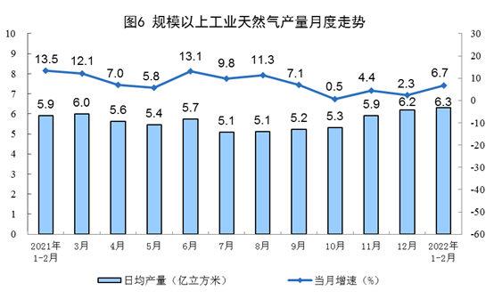 天然氣生產(chǎn)保持增長,進(jìn)口下降。1—2月份,生產(chǎn)天然氣372億立方米,同比增長6.7%,增速比上年12月份加快4.4個(gè)百分點(diǎn),日均產(chǎn)量6.3億立方米。進(jìn)口天然氣1986萬噸,同比下降3.8%,上年12月份為增長4.6%。