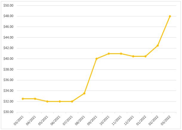 天然鈾現(xiàn)貨價(jià)格(2021.3-2022.3)