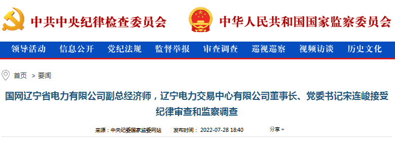 本網(wǎng)訊 中央紀(jì)委國家監(jiān)委網(wǎng)站7月28日消息,據(jù)中央紀(jì)委國家監(jiān)委駐國家電網(wǎng)有限公司紀(jì)檢監(jiān)察組、遼寧省紀(jì)委監(jiān)委消息:國網(wǎng)遼寧省電力有限公司副總經(jīng)濟(jì)師,遼寧電力交易中心有限公司董事長、黨委書記宋連峻涉嫌嚴(yán)重違紀(jì)違法,目前正接受中央紀(jì)委國家監(jiān)委駐國家電網(wǎng)有限公司紀(jì)檢監(jiān)察組紀(jì)律審查和朝陽市監(jiān)察委員會(huì)監(jiān)察調(diào)查。