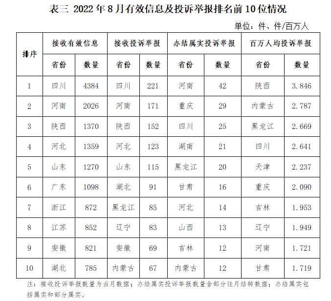 各省(自治區(qū)、直轄市)按照接收的有效信息數(shù)量排序,四川、河南、陜西、河北、山東、廣東、浙江、江蘇、安徽、湖北排在全國(guó)前10位;按照接收的投訴舉報(bào)數(shù)量排序,四川、河南、陜西、河北、山東、湖北、黑龍江、遼寧、安徽、內(nèi)蒙古排在全國(guó)前10位;按照辦結(jié)屬實(shí)的投訴舉報(bào)數(shù)量排序,河南、重慶、四川、湖南、黑龍江、甘肅、河北、山西、吉林、內(nèi)蒙古排在全國(guó)前10位;按照百萬人均投訴舉報(bào)數(shù)量排序,陜西、內(nèi)蒙古、黑龍江、四川、天津、重慶、吉林、遼寧、河南、甘肅排在全國(guó)前10位。(2022年8月有效信息及投訴舉報(bào)排名前10位情況見表三)