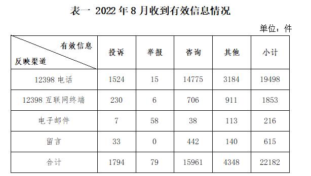 2022年8月,國(guó)家能源局12398能源監(jiān)管熱線(以下簡(jiǎn)稱12398熱線)共收到有效信息22182件(包含投訴、舉報(bào)、咨詢和其他訴求類別),環(huán)比增加18.10%,同比增加77.67%。(2022年8月收到有效信息情況見表一)