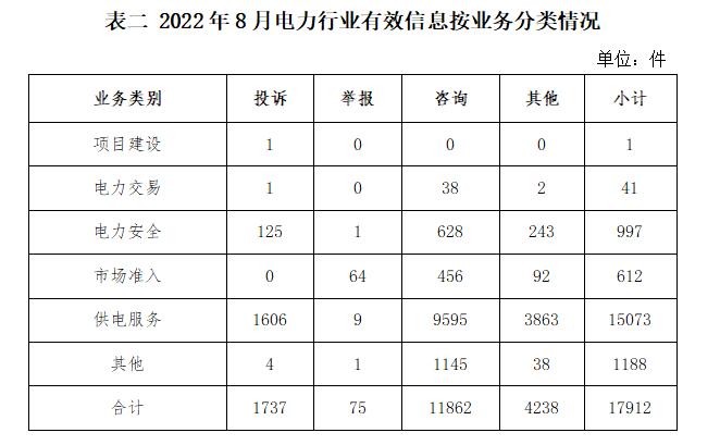 電力行業(yè)排在首位,有效信息數(shù)量為17912件,占全部有效信息的80.75%。群眾關(guān)注的內(nèi)容主要集中在供電服務(wù)、電力安全、市場(chǎng)準(zhǔn)入等方面。(2022年8月電力行業(yè)有效信息按業(yè)務(wù)分類情況見表二)