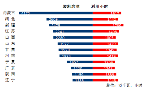 圖3 1-8月份風(fēng)電裝機(jī)較多省份風(fēng)電裝機(jī)容量和設(shè)備利用小時(shí)