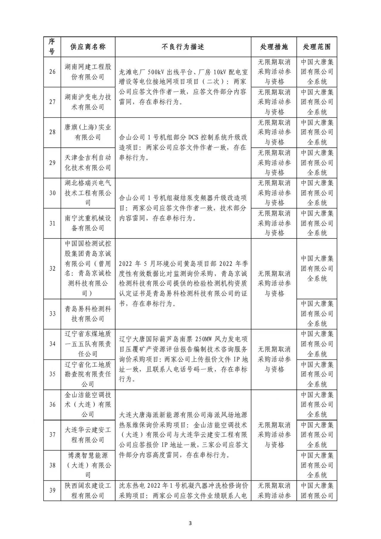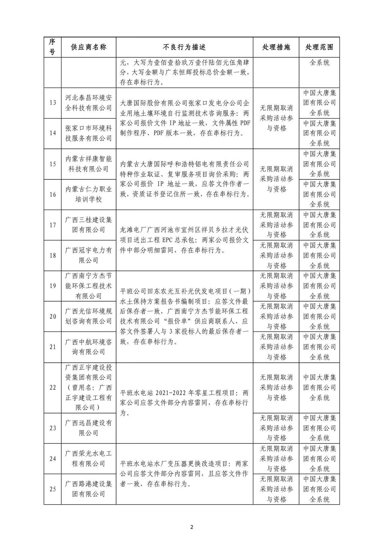 中國大唐集團(tuán)有限公司關(guān)于供應(yīng)商不良行為處理情況的公告 (2022年第8批)