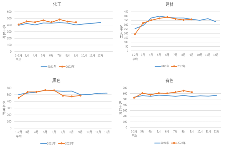 1-9月,化工行業(yè)用電量4065億千瓦時(shí),同比增長5.1%;建材行業(yè)用電量2960億千瓦時(shí),同比下降4.2%;黑色金屬冶煉行業(yè)用電量4583億千瓦時(shí),同比下降5.3%;有色金屬冶煉行業(yè)用電量5556億千瓦時(shí),同比增長3.0%。