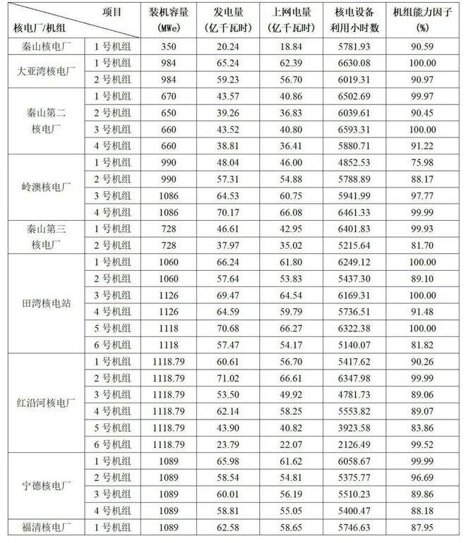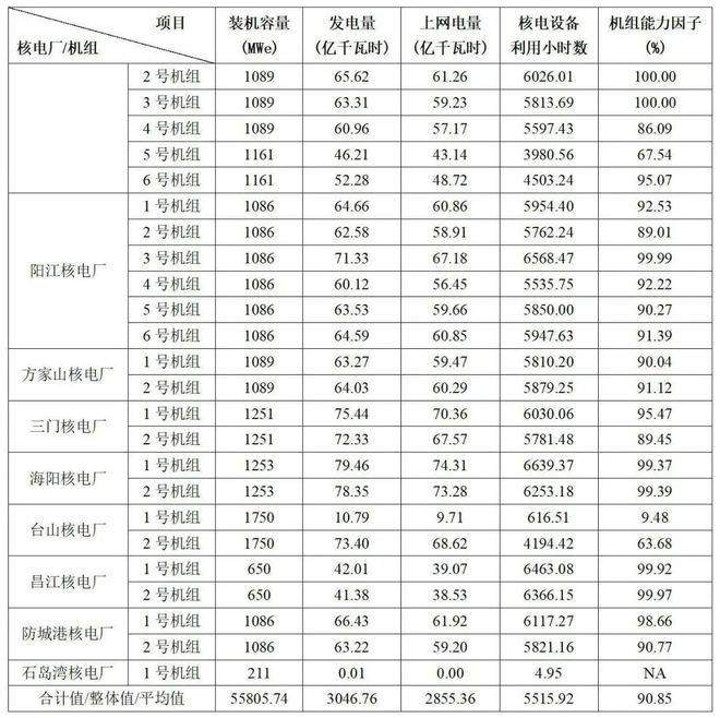 3)本表“合計值/整體值/平均值”中,裝機(jī)容量、發(fā)電量、上網(wǎng)電量為各機(jī)組合計值,核電設(shè)備利用小時數(shù)為全部機(jī)組整體值,機(jī)組能力因子為全部機(jī)組的算數(shù)平均值。