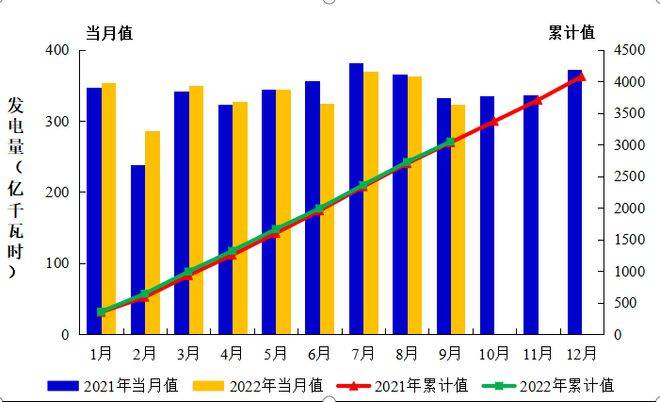 圖2:2021年1月至2022年9月全國運行核電機(jī)組發(fā)電量趨勢
