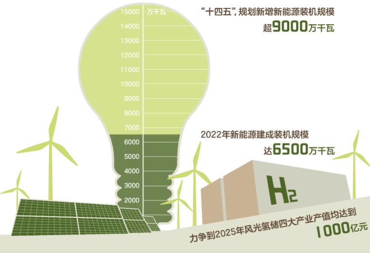 2022年,內(nèi)蒙古新能源建成裝機(jī)規(guī)模達(dá)到6500萬千瓦,連續(xù)兩年成為全國唯一一個(gè)風(fēng)電光伏發(fā)電量超過1000億千瓦時(shí)的省區(qū)。“十四五”期間,內(nèi)蒙古規(guī)劃新增超過9000萬千瓦的新能源裝機(jī)規(guī)模,力爭到2025年風(fēng)光氫儲四大產(chǎn)業(yè)產(chǎn)值均達(dá)到1000億元。