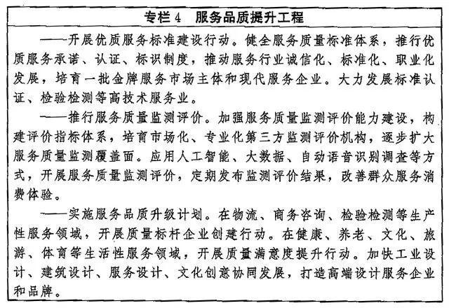 (七)提高產(chǎn)業(yè)質(zhì)量競爭水平。推動(dòng)產(chǎn)業(yè)質(zhì)量升級(jí),加強(qiáng)產(chǎn)業(yè)鏈全面質(zhì)量管理,著力提升關(guān)鍵環(huán)節(jié)、關(guān)鍵領(lǐng)域質(zhì)量管控水平。開展對(duì)標(biāo)達(dá)標(biāo)提升行動(dòng),以先進(jìn)標(biāo)準(zhǔn)助推傳統(tǒng)產(chǎn)業(yè)提質(zhì)增效和新興產(chǎn)業(yè)高起點(diǎn)發(fā)展。推進(jìn)農(nóng)業(yè)品種培優(yōu)、品質(zhì)提升、品牌打造和標(biāo)準(zhǔn)化生產(chǎn),全面提升農(nóng)業(yè)生產(chǎn)質(zhì)量效益。加快傳統(tǒng)制造業(yè)技術(shù)迭代和質(zhì)量升級(jí),強(qiáng)化戰(zhàn)略性新興產(chǎn)業(yè)技術(shù)、質(zhì)量、管理協(xié)同創(chuàng)新,培育壯大質(zhì)量競爭型產(chǎn)業(yè),推動(dòng)制造業(yè)高端化、智能化、綠色化發(fā)展,大力發(fā)展服務(wù)型制造。加快培育服務(wù)業(yè)新業(yè)態(tài)新模式,以質(zhì)量創(chuàng)新促進(jìn)服務(wù)場景再造、業(yè)務(wù)再造、管理再造,推動(dòng)生產(chǎn)性服務(wù)業(yè)向?qū)I(yè)化和價(jià)值鏈高端延伸,推動(dòng)生活性服務(wù)業(yè)向高品質(zhì)和多樣化升級(jí)。完善服務(wù)業(yè)質(zhì)量標(biāo)準(zhǔn),加強(qiáng)服務(wù)業(yè)質(zhì)量監(jiān)測,優(yōu)化服務(wù)業(yè)市場環(huán)境。加快大數(shù)據(jù)、網(wǎng)絡(luò)、人工智能等新技術(shù)的深度應(yīng)用,促進(jìn)現(xiàn)代服務(wù)業(yè)與先進(jìn)制造業(yè)、現(xiàn)代農(nóng)業(yè)融合發(fā)展。