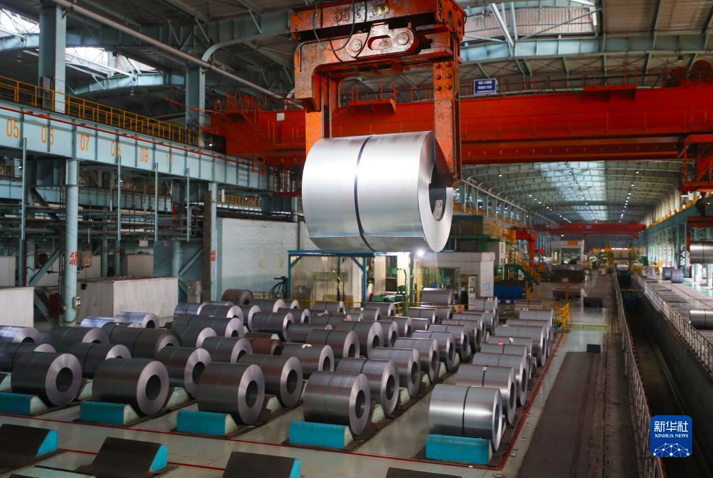 在本鋼冷軋廠,吊車(chē)在吊裝鋼卷(2021年8月18日攝)。