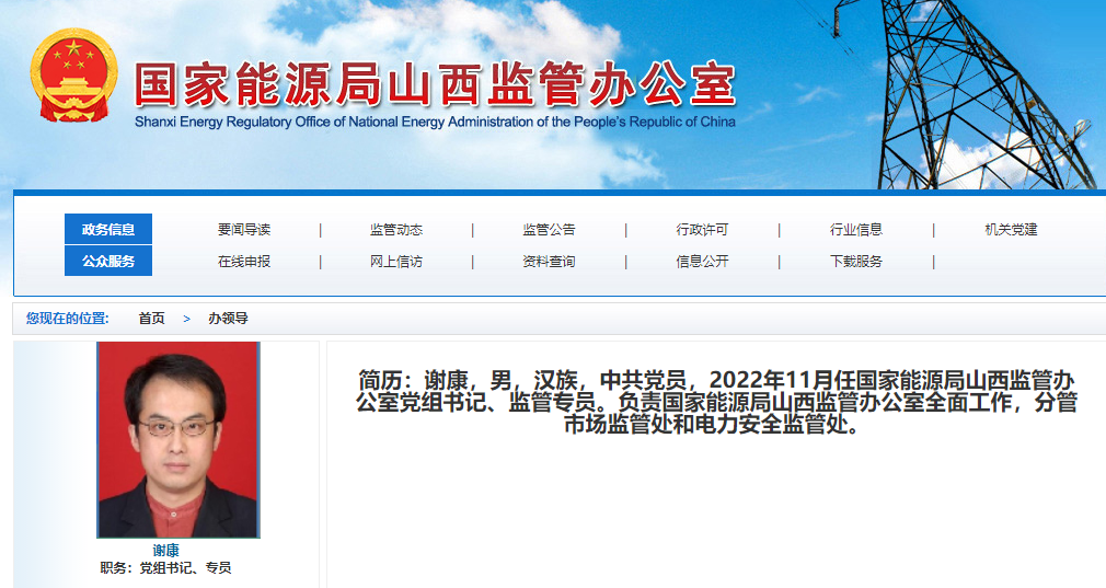 國家能源局山西監(jiān)管辦公室官網(wǎng)顯示,謝康已任國家能源局山西監(jiān)管辦公室黨組書記、監(jiān)管專員。