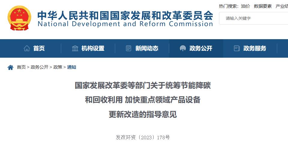 國家發(fā)展改革委等部門關于統(tǒng)籌節(jié)能降碳和回收利用 加快重點領域產(chǎn)品設備更新改造的指導意見