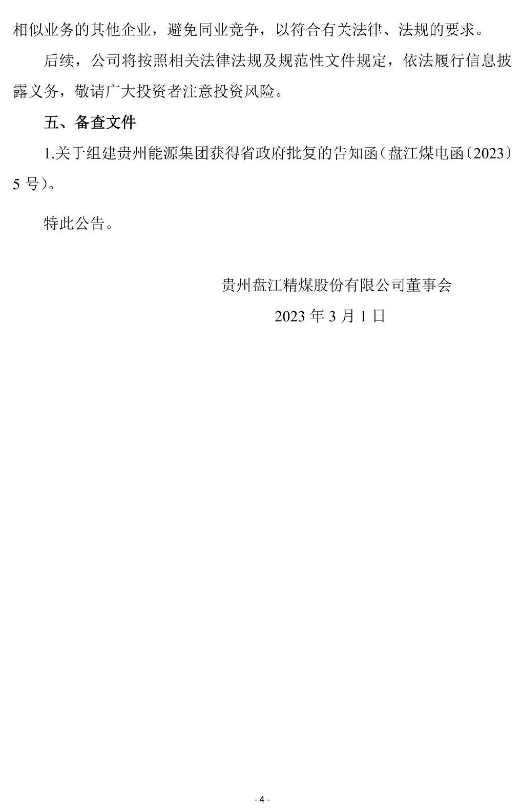 《公告》稱,貴州能源集團(tuán)組建完成后,將圍繞建設(shè)新型綜合能源基地和打造西南地區(qū)煤炭保供中心戰(zhàn)略定位,打造成為千億級(jí)全國清潔能源供應(yīng)商和全國一流能源企業(yè)。貴州能源集團(tuán)的發(fā)展壯大,將有利于促進(jìn)盤江股份“以煤為主、延伸產(chǎn)業(yè)鏈、科學(xué)發(fā)展”的戰(zhàn)略實(shí)施,從而實(shí)現(xiàn)上市公司做強(qiáng)做優(yōu)做大。