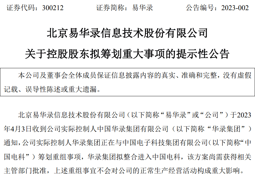 4月3日,北京易華錄信息技術(shù)股份有限公司發(fā)布公告稱,收到公司實(shí)際控制人中國(guó)華錄集團(tuán)有限公司(以下簡(jiǎn)稱“華錄集團(tuán)”)通知,華錄集團(tuán)正在與中國(guó)電子科技集團(tuán)有限公司(以下簡(jiǎn)稱“中國(guó)電科”)籌劃重組事項(xiàng),華錄集團(tuán)擬整合進(jìn)入中國(guó)電科。易華錄表示,該方案尚需獲得相關(guān)主管部門批準(zhǔn),上述重組事宜不會(huì)對(duì)公司的正常生產(chǎn)經(jīng)營(yíng)活動(dòng)構(gòu)成重大影響。公司將按照法律法規(guī)的要求及時(shí)披露進(jìn)展情況。