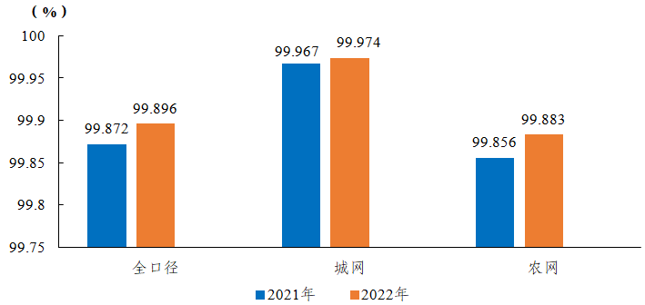2022年,全國(guó)用戶平均供電可靠率99.896%,同比上升0.025個(gè)百分點(diǎn),其中,城網(wǎng)99.974%,農(nóng)網(wǎng)99.883%。城網(wǎng)與農(nóng)網(wǎng)相差0.091個(gè)百分點(diǎn)。