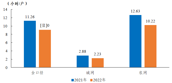 全國(guó)用戶平均停電時(shí)間9.10小時(shí)/戶,同比減少2.16小時(shí)/戶,其中城網(wǎng)2.23小時(shí)/戶,農(nóng)網(wǎng)10.22小時(shí)/戶。城網(wǎng)與農(nóng)網(wǎng)相差7.99小時(shí)/戶。