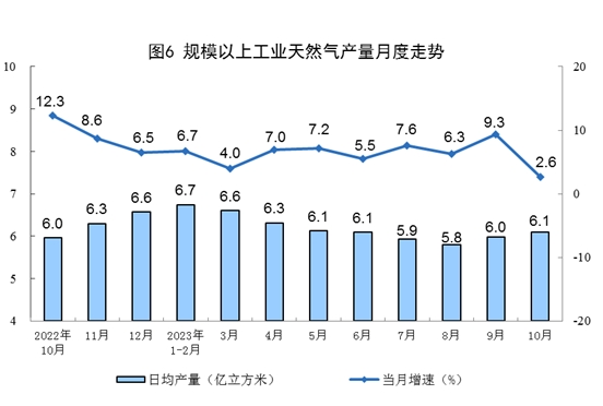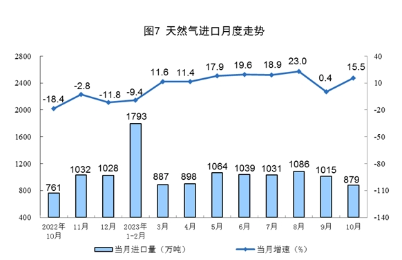 天然氣生產(chǎn)保持平穩(wěn),進(jìn)口增速加快。10月份,生產(chǎn)天然氣190億立方米,同比增長2.6%,增速比9月份回落6.7個百分點,日均產(chǎn)量6.1億立方米。進(jìn)口天然氣879萬噸,同比增長15.5%,增速比9月份加快15.1個百分點。