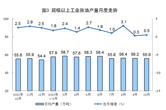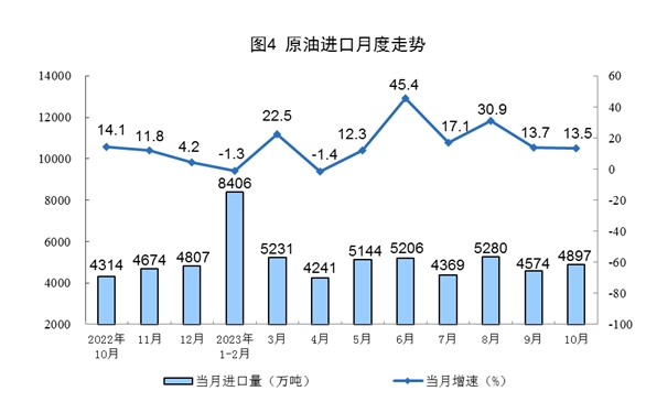 原油生產(chǎn)增速略有加快,進(jìn)口保持較快增長。10月份,生產(chǎn)原油1733萬噸,同比增長0.5%,增速比9月份加快0.2個百分點,日均產(chǎn)量55.9萬噸。進(jìn)口原油4897萬噸,同比增長13.5%,增速比9月份放緩0.2個百分點。