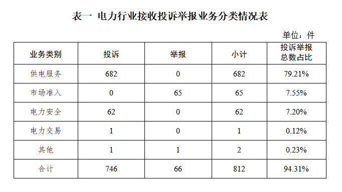 電力行業(yè)排在首位,數(shù)量為812件、占投訴舉報總數(shù)的94.31%,主要集中在供電服務(wù)、市場準(zhǔn)入、電力安全等方面。