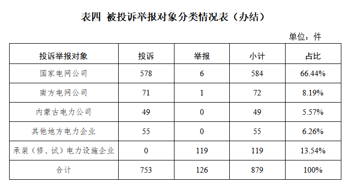 從被投訴舉報對象看,供電企業(yè)760件、占投訴舉報總數(shù)的86.46%,其中國家電網(wǎng)公司584件、占比66.44%,南方電網(wǎng)公司72件、占比8.19%,內(nèi)蒙古電力公司49件、占比5.57%,其他地方電力企業(yè)55件、占比6.26%;承裝(修、試)電力設(shè)施企業(yè)119件、占比13.54%。