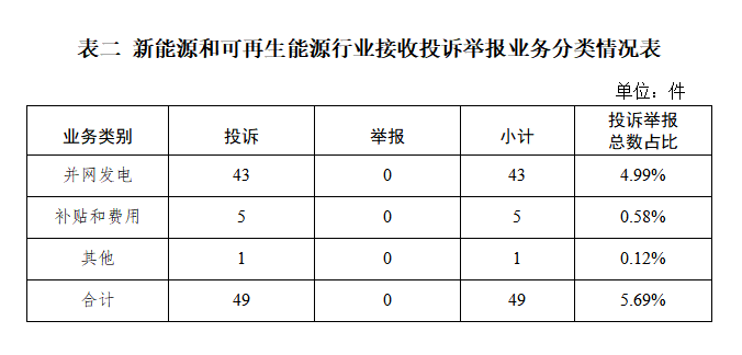 新能源和可再生能源行業(yè)排在第二位,數(shù)量為49件、占投訴舉報總數(shù)的5.69%,主要集中在并網(wǎng)發(fā)電、補貼和費用等方面。