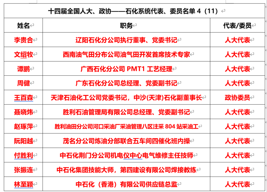 “由能轉(zhuǎn)仕”的十四屆全國(guó)人大代表、政協(xié)委員有10人,其中全國(guó)人大代表8人,政協(xié)委員2人。如中央政治局委員、中央書記處書記李干杰,曾任生態(tài)環(huán)境部原部長(zhǎng)、黨組書記,中央政治局委員、上海市委書記陳吉寧曾任環(huán)保部部長(zhǎng),交通運(yùn)輸部部長(zhǎng)李小鵬曾任中國(guó)華能總經(jīng)理,上海市委常委、紀(jì)委書記李仰哲曾任國(guó)家能源局副局長(zhǎng),深圳市長(zhǎng)覃偉中曾任中國(guó)石油副總經(jīng)理,遼寧省委書記郝鵬曾任國(guó)務(wù)院國(guó)資委主任,江蘇省副省長(zhǎng)胡廣杰曾任中國(guó)海油副總經(jīng)理,湖南省省長(zhǎng)毛偉明曾任國(guó)家電網(wǎng)董事長(zhǎng),丁雄軍曾任貴州能源局原局長(zhǎng)。