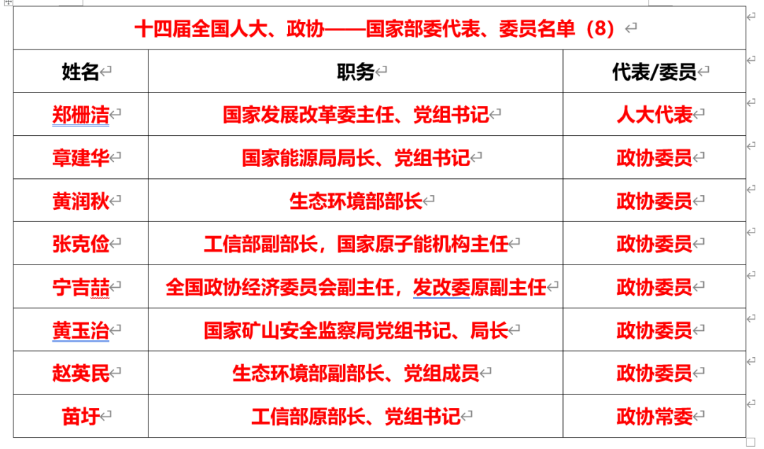 國(guó)家部委層面,有國(guó)家發(fā)展改革委黨組書記、主任鄭柵潔,生態(tài)環(huán)境部部長(zhǎng)黃潤(rùn)秋,國(guó)家能源局局長(zhǎng)、黨組書記章建華,國(guó)家礦山安全監(jiān)察局黨組書記、局長(zhǎng)黃玉治,工信部副部長(zhǎng),國(guó)家原子能機(jī)構(gòu)主任張克儉,全國(guó)政協(xié)經(jīng)濟(jì)委員會(huì)副主任,生態(tài)環(huán)境部副部長(zhǎng)、黨組成員趙英民,國(guó)家發(fā)改委原副主任寧吉喆,工信部原部長(zhǎng)、黨組書記苗圩8人。
