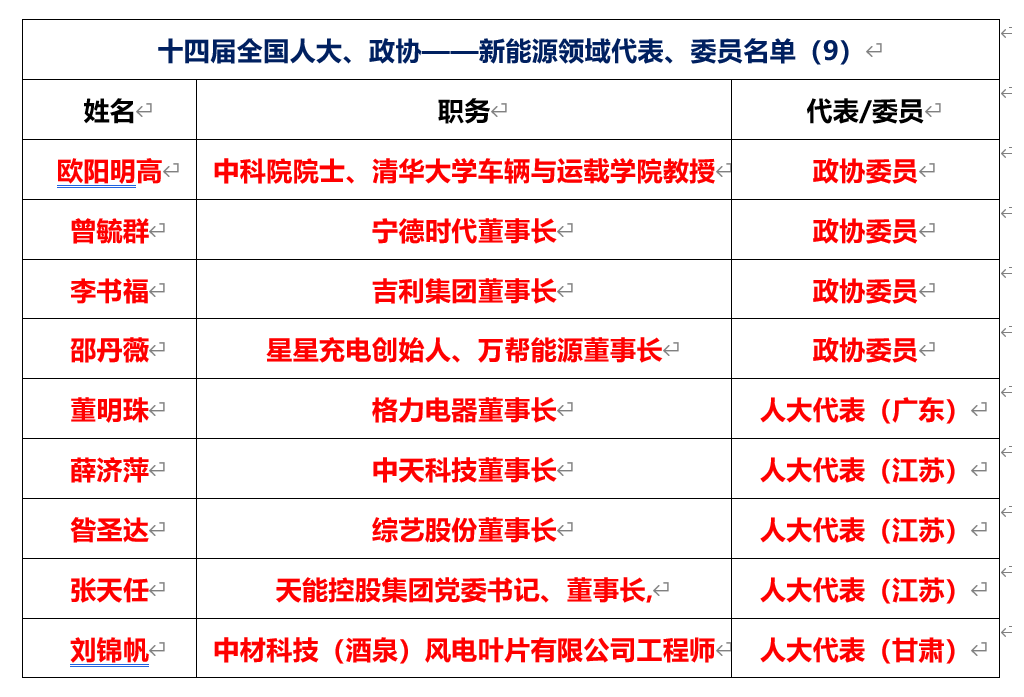 新能源領(lǐng)域有7人當(dāng)選十四屆全國(guó)人大代表、政協(xié)委員,格力電器董明珠、寧德時(shí)代曾毓群、吉利集團(tuán)李書福等人當(dāng)選。