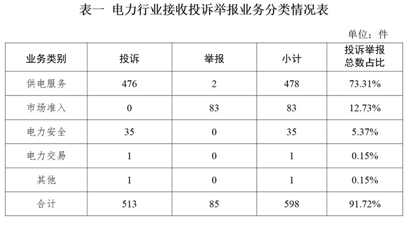 電力行業(yè)排在首位,數(shù)量為598件、占投訴舉報(bào)總數(shù)的91.72%,主要集中在供電服務(wù)、市場(chǎng)準(zhǔn)入、電力安全等方面。