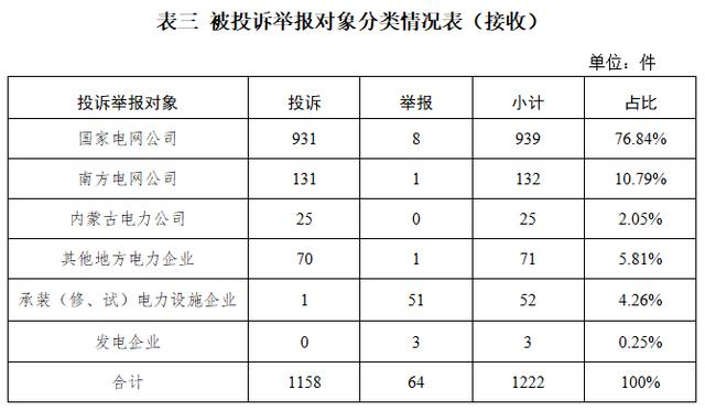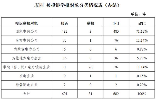 從被投訴舉報(bào)對(duì)象看,供電企業(yè)603件、占投訴舉報(bào)總數(shù)的88.42%,其中:國(guó)家電網(wǎng)公司485件、占比71.12%;南方電網(wǎng)公司76件、占比11.14%;內(nèi)蒙古電力公司6件、占比0.88%;其他地方電力企業(yè)36件、占比5.28%。承裝(修、試)電力設(shè)施企業(yè)76件、占比11.14%;發(fā)電企業(yè)1件、占比0.15%;增量配電企業(yè)2件、占比0.29%。