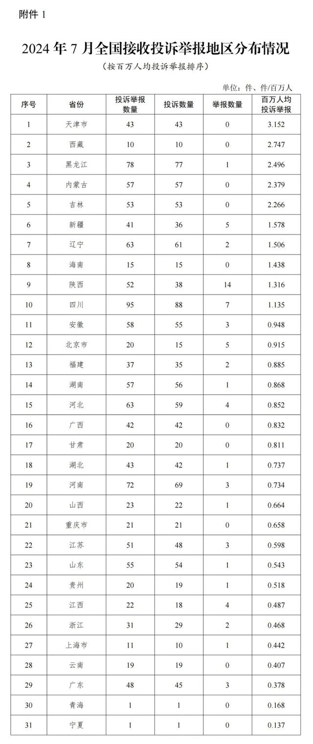 各省(自治區(qū)、直轄市)按照接收投訴舉報(bào)數(shù)量排序,四川、黑龍江、河南、遼寧、安徽排在全國(guó)前5位。按百萬(wàn)人均投訴舉報(bào)數(shù)量排序,天津、西藏、黑龍江、內(nèi)蒙古、吉林排在全國(guó)前5位。(2024年7月全國(guó)接收投訴舉報(bào)地區(qū)分布情況,見附件1)