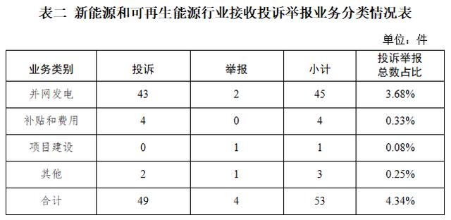 新能源和可再生能源行業(yè)排在第二位,數(shù)量為53件、占投訴舉報(bào)總數(shù)的4.34%,主要集中在并網(wǎng)發(fā)電方面。