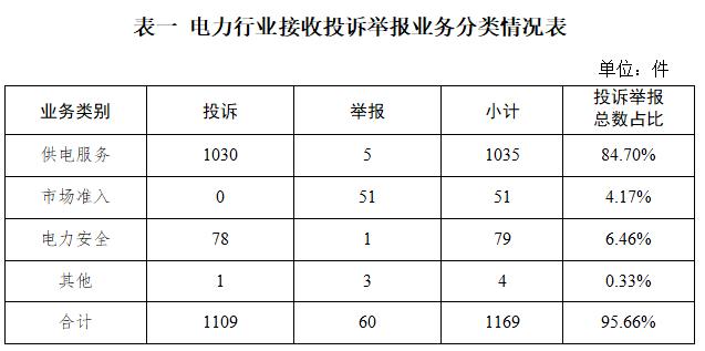 電力行業(yè)排在首位,數(shù)量為1169件、占投訴舉報(bào)總數(shù)的95.66%,主要集中在供電服務(wù)、電力安全、市場(chǎng)準(zhǔn)入等方面。