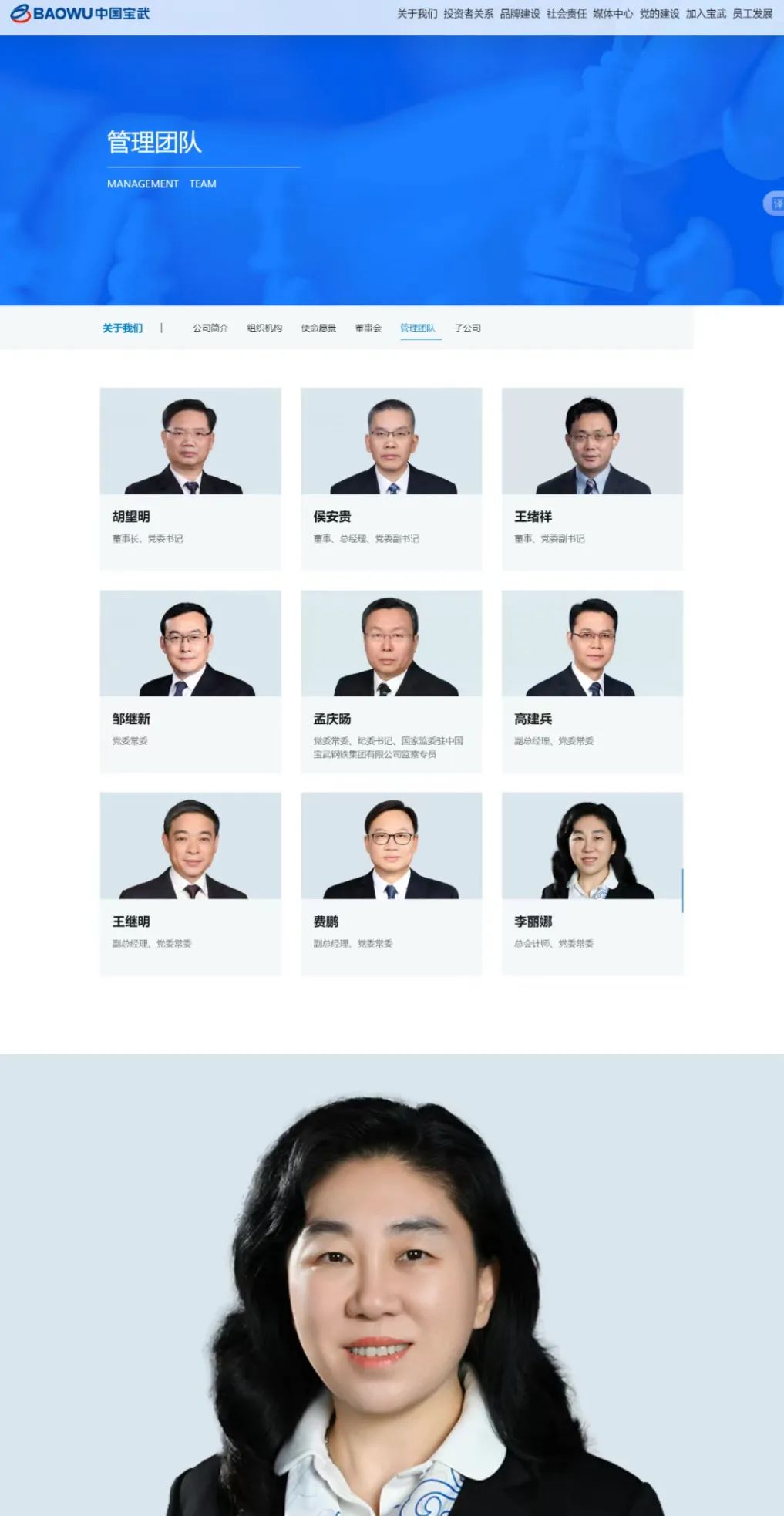 據(jù)中國(guó)寶武鋼鐵集團(tuán)有限公司(以下簡(jiǎn)稱“寶武鋼鐵集團(tuán)”)官網(wǎng)“管理團(tuán)隊(duì)”欄目最新信息顯示,李麗娜已任集團(tuán)總會(huì)計(jì)師、黨委常委。她此前擔(dān)任中國(guó)能源建設(shè)股份有限公司黨委常委、總會(huì)計(jì)師。