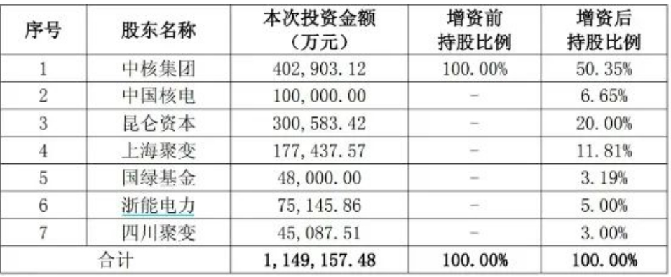 相關(guān)信息顯示中核集團(tuán)、中國核電、浙能電力、中國石油集團(tuán)昆侖資本有限公司、上海未來聚變能源科技有限公司、國家綠色發(fā)展基金股份有限公司及四川重科聚變能源科技有限公司,以1.0019元/注冊(cè)資本的價(jià)格,共同向中國聚變能源有限公司投資約114.92億元,認(rèn)購聚變公司新增注冊(cè)資本114.69億元。其中,中核集團(tuán)本輪出資40.29億元,增資后持有中國聚變公司50.35%股份。中國核電投資金額為10億元,持有聚變公司6.65%股權(quán);浙能電力出資約7.51億元,持有聚變公司5%股權(quán)。此外,中石油旗下昆侖資本此次投資約30.06億元,獲得中國聚變公司20%股份,成為第二大股東,本次增資完成后,聚變公司的注冊(cè)資本為150億元,具體股權(quán)結(jié)構(gòu)如下: