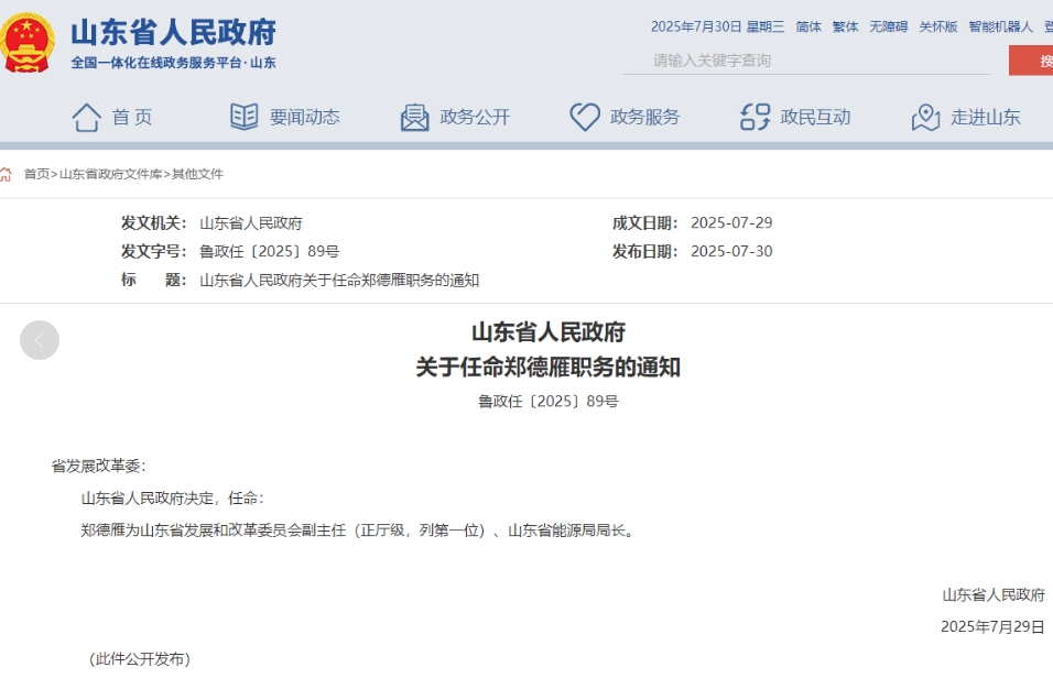 7月30日,山東省人民政府發(fā)布關(guān)于任命鄭德雁職務(wù)通知。任命鄭德雁為山東省發(fā)展和改革委員會副主任(正廳級,列第一位)、山東省能源局局長。