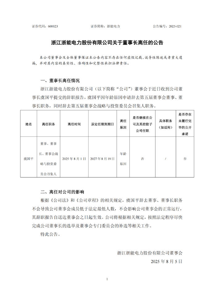 董事長虞國平因年齡原因申請辭去第五屆董事會董事及董事長職務(wù),離任時間為2025年8月1日,原定任期到期日為2027年8月19日。