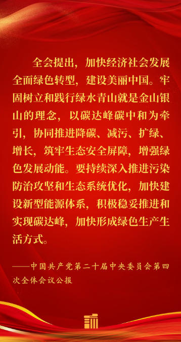 全會提出,加快經(jīng)濟社會發(fā)展全面綠色轉型,建設美麗中國。牢固樹立和踐行綠水青山就是金山銀山的理念,以碳達峰碳中和為牽引,協(xié)同推進降碳、減污、擴綠、增長,筑牢生態(tài)安全屏障,增強綠色發(fā)展動能。要持續(xù)深入推進污染防治攻堅和生態(tài)系統(tǒng)優(yōu)化,加快建設新型能源體系,積極穩(wěn)妥推進和實現(xiàn)碳達峰,加快形成綠色生產(chǎn)生活方式。