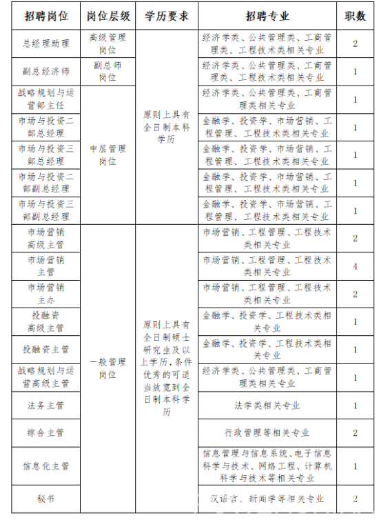 4.主導完成3個及以上投資金額30億元以上的項目。具備機關、事業(yè)單位處級或國有企業(yè)相對應層級崗位工作經驗的優(yōu)先;