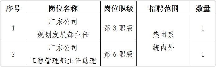 根據(jù)工作需要,依據(jù)公司招聘管理相關(guān)規(guī)定,現(xiàn)對廣東公司(海外公司)規(guī)劃發(fā)展部主任等兩個崗位進(jìn)行公開招聘。