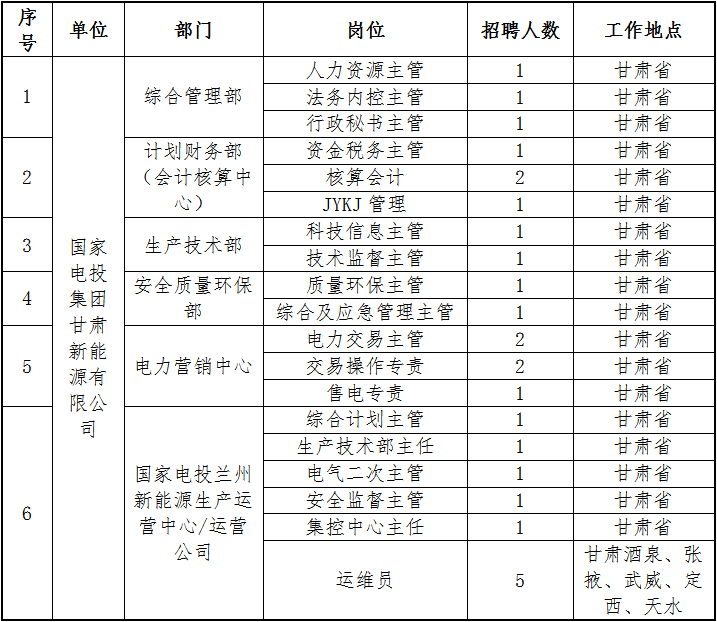 國家電投集團甘肅新能源有限公司(簡稱:國家電投甘肅新能源公司)成立于2016年,是國家電力投資集團有限公司(簡稱:國家電投)在甘肅地區(qū)設(shè)立的新能源投資、開發(fā)、建設(shè)和運營企業(yè),與國家電投甘肅分公司一體化運作。國家電投甘肅分公司為國家電投二級單位,主要承擔所在地區(qū)區(qū)域規(guī)劃、政府對接、市場開發(fā)、電力營銷、品牌建設(shè)等工作。
