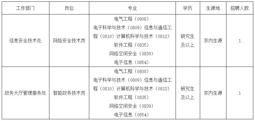 1.信息安全技術(shù)處:網(wǎng)絡(luò)安全技術(shù)崗工作人員1名(京內(nèi)生源研究生及以上應(yīng)屆畢業(yè)生)。專業(yè)為電氣工程(0808)、電子科學(xué)與技術(shù)(0809)、信息與通信工程(0810)、計(jì)算機(jī)科學(xué)與技術(shù)(0812)、軟件工程(0835)、網(wǎng)絡(luò)空間安全(0839)、電子信息(0854)。要求熟悉網(wǎng)絡(luò)安全和數(shù)據(jù)安全防護(hù)技術(shù)、法律法規(guī)和管理知識,作風(fēng)正派、嚴(yán)謹(jǐn)細(xì)致、踏實(shí)肯干,責(zé)任心強(qiáng)、執(zhí)行力強(qiáng)、服務(wù)意識強(qiáng),具有較強(qiáng)的溝通協(xié)調(diào)能力和文字功底。